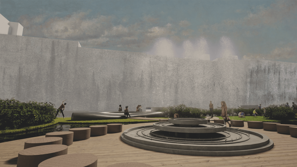 As a small prototype of water drainage, this installation stores rainwater and pumps it upwards to create an interactive activity during the summer months, thus adapting to the seasons.