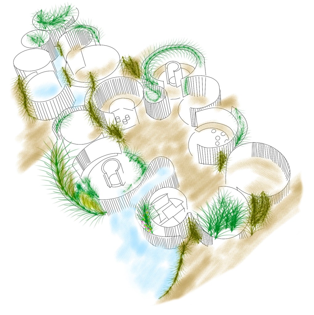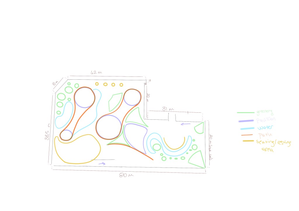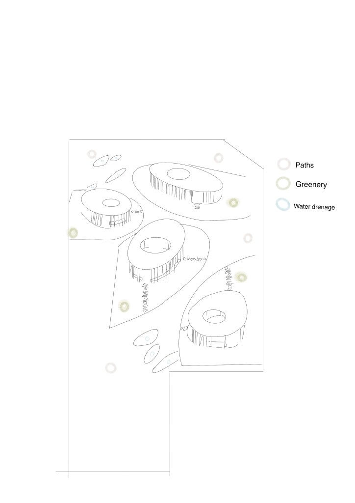 Sketch: The sketch aims to create a fine line between private and public spaces by dividing the area into small rooms. The system, which is also envisioned to include green spaces, would, much like the Green Rooftop project, help reduce the burden on city infrastructure by having plants absorb rainwater first and then evaporate it.