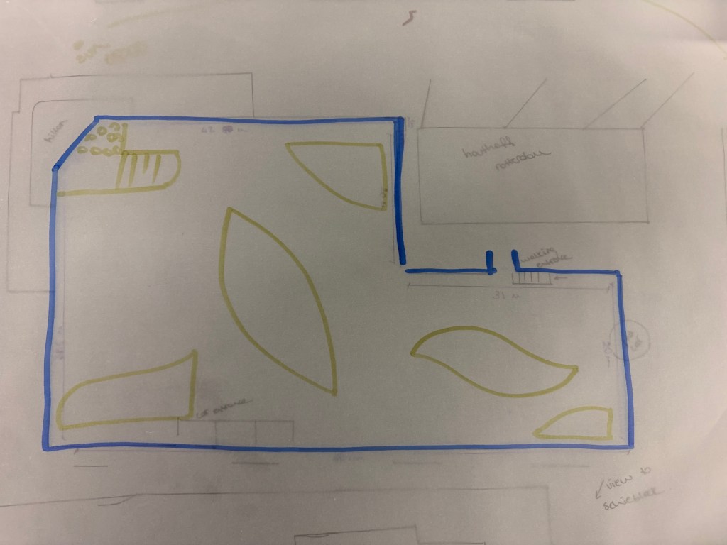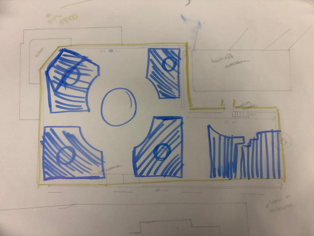 Sketches: The area is open, free, but systematically divided by greenery and various other elements using drawn patterns.