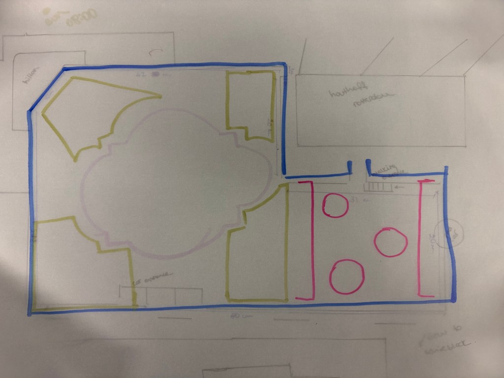 Reference: Divison made softly. No hard walls or definite boundaries have been drawn. Paths connected the entrances and aimed to create an open space.