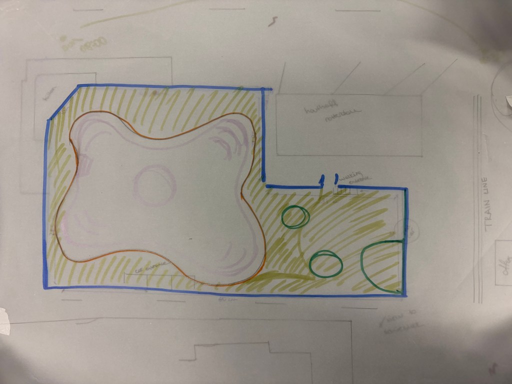 Sketch: Divided into a stepped seating area amidst greenery.