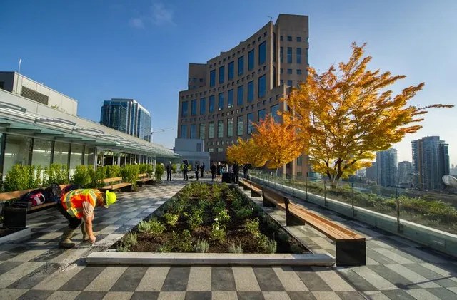 The old elevated train line is transformed into a park, with a linear landscaping system.